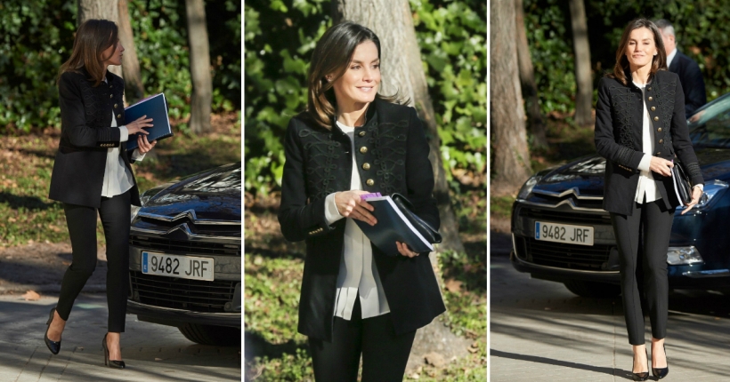 На денешниот состанок на „Фондацијата за помош против зависноста од дрога“ во Мадрид, Летиција се појави во фантастично деловно издание со црни панталони, бела кошула и црно сако Zara во милитаристички стил.