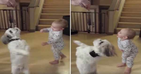 Слатко момче го имитираше своето кученце кое на две нозе се вртеше во круг радувајќи се на храната која му ја даваат, а тој интересен момент беше овековечен со видео. Погледнете го: