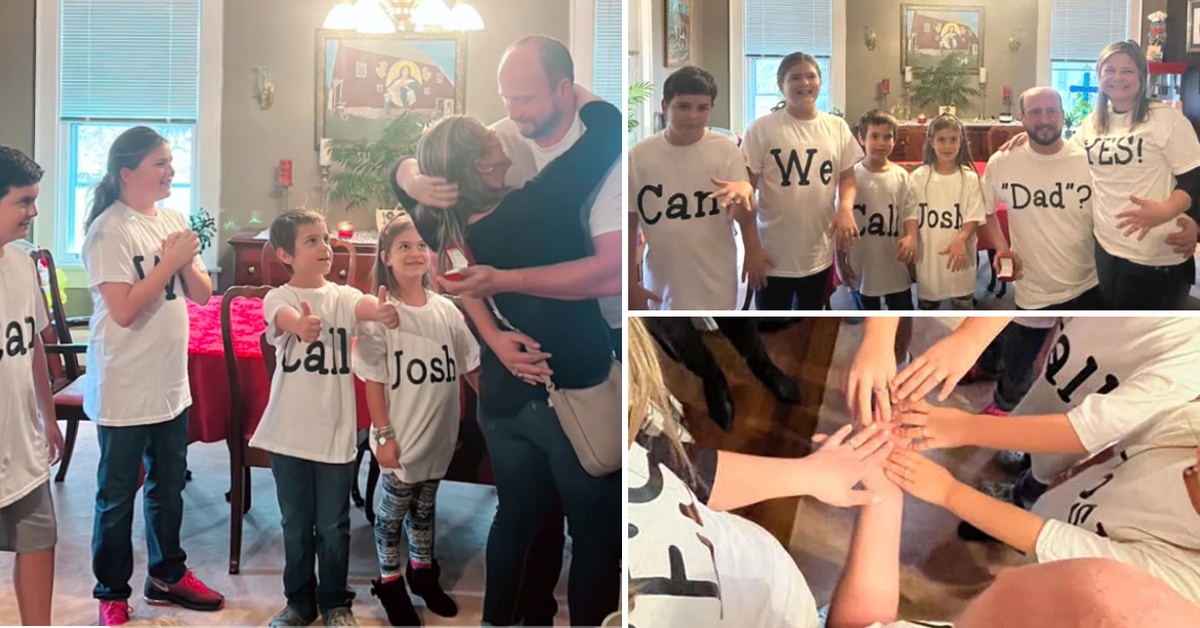 Во него, Џош и четирите деца носат маици на кои пишува: „Дали може да го викаме Џош ‘Тато’?“, додека тој е клекнат на едно колено држејќи го прстенот во раката.
