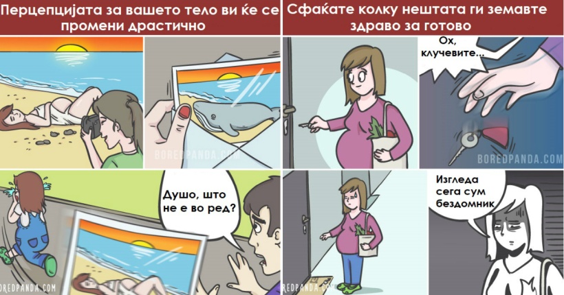 Утрински мачнини, силна желба за невообичаени комбинации на храна, потешкотии во пронаоѓањето на соодветна облека и обувки... Bored Panda создаде илустрации за слатките маки на жените во бременоста во кои ќе се препознаат голем број мајки и трудници.