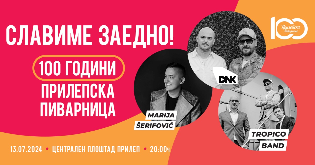 Не ја пропуштајте можноста да бидете дел од историјата и да прославите 100 години успешност заедно со нас. Придружете ни се на 13 јули на плоштадот Методија Андонов – Ченто во Прилеп, за незаборавна вечер со музика, веселба и убави спомени.