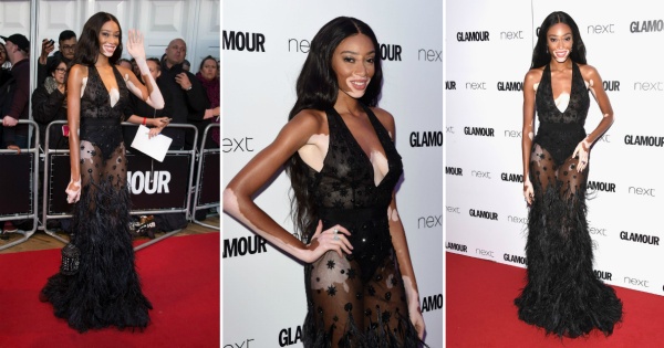 На настанот во Лондон, славната менекенка, која страда од витилиго, гордо ги покажа белите дамки по телото во проѕирна црна креација со пердуви во долниот дел.