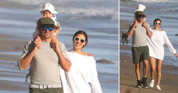 7-месечната Леа седеше удобно на рамената на холивудскиот актер додека покрај нив се движеше насмеаната манекенка.