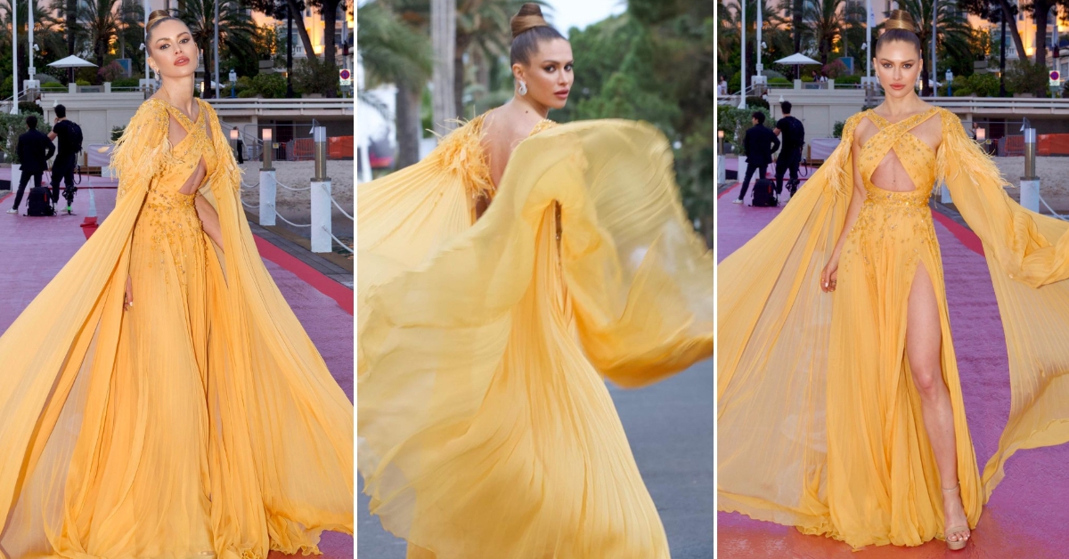 За 76-тото издание на Филмскиот фестивал на француската ривиера, 29-годишната блогерка од Словенија избра портокалова плисирана креација со прикачена наметка од либанскиот дизајнер Зухаир Мурад.