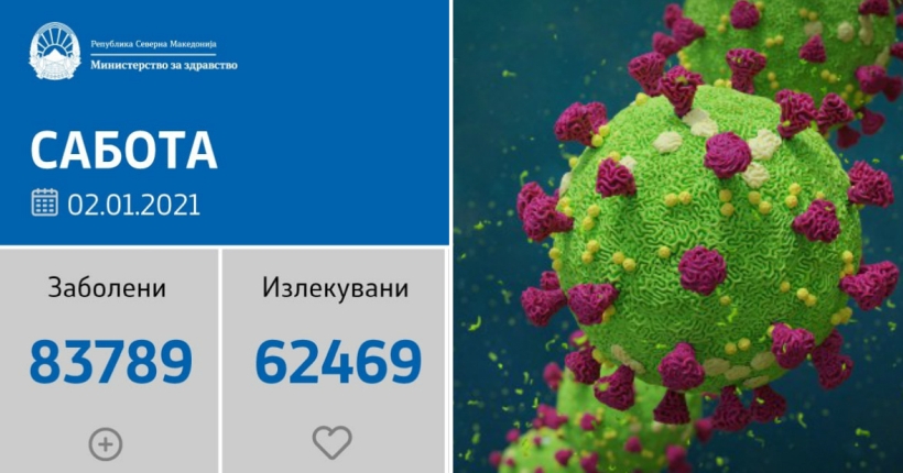 Вкупната бројка на ковид дијагностицирани во нашата земја од почетокот на епидемијата изнесува 83.789, бројката на оздравени пациенти е 62.469, на починати е 2.522, а бројот на активни случаи изнесува 18.798.