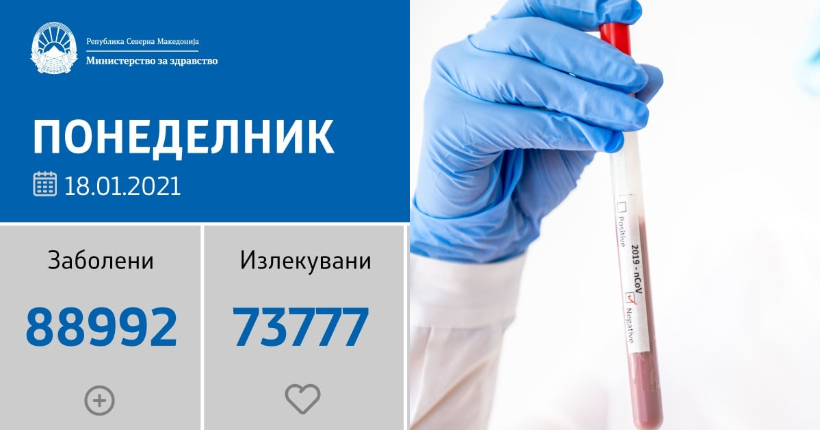 Вкупната бројка на ковид дијагностицирани во нашата земја од почетокот на епидемијата изнесува 88.992, бројката на оздравени пациенти е 73.777, на починати е 2.715, а бројот на активни случаи изнесува 12.500.