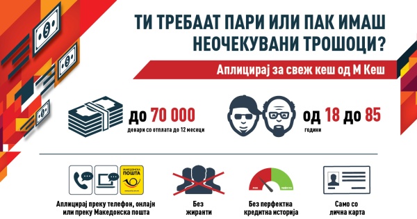 М KЕШ, водечката финансиска институција од овој тип во Македонија го олесни пристапот до кредити со тоа што ја зголеми старосната граница на кредитобарателите на 85 години, ги намали критериумите за аплицирање со тоа што сега не е потребен договор за неопределено вработување, воедно и го олесни начинот на аплицирање и понуди најбрзо одобрување на крeдит. Затоа М КЕШ нуди модерна, достапна и иновативна финансиска услуга, нешто што досега го немаше на нашиот пазар. Секој од вас може да аплицира за износ од 3.000 до 70.000 денари за потребите на вашите домаќинствата, неочекувани трошоци, како и за пазарување. А аплицирањето не било никогаш полесно – аплицирајте единствено со лична карта на телефон или онлајн, а кредитот се одобрува за 5 минути. Сѐ ова е дел од иновативниот пристап на М КЕШ, пристап кој им овозможи да станаат лидери на овој пазар во Македонија.