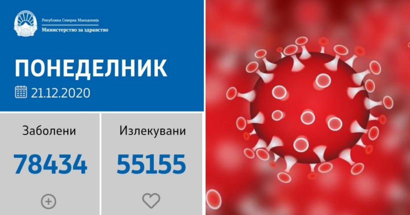 Вкупната бројка на ковид дијагностицирани во нашата земја од почетокот на епидемијата изнесува 78.434, бројката на оздравени пациенти е 55.155, на починати е 2.314, а бројот на активни случаи изнесува 20.965.