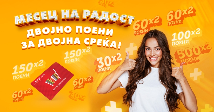 Искористете ги двојните придобивки од пазарувањето со Веро картичката. При секое пазарување во Веро до крајот на месецов, со секој купен производ кој носи и дополнителни поени, поените на Веро картичката се дуплираат. Така, освен што потрошувачите добиваат двојно повеќе поени, добиваат и двојни придобивки од месецот на радост во Веро.