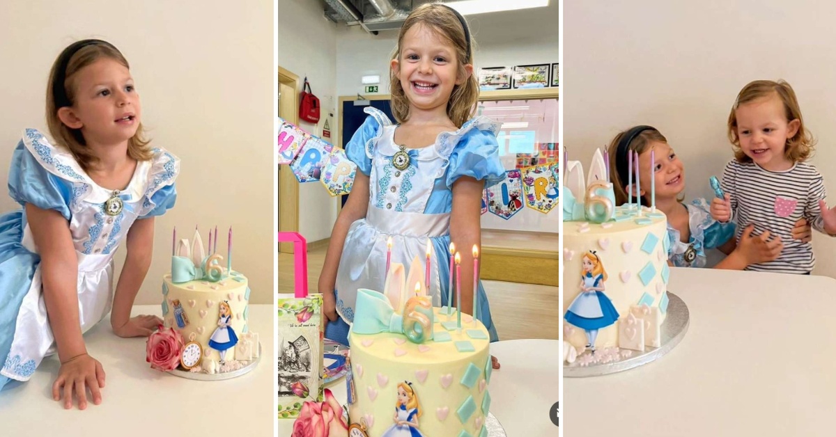 Слатката славеничка е облечена како Алиса во земјата на чудата и ги дува свеќичките на роденденската торта со својата помала сестричка.