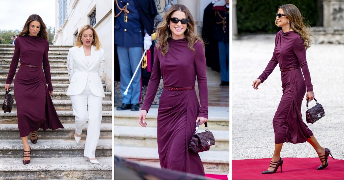 На состанокот во Рим, шармантната јорданска кралица изгледаше софистицирано во елегантен фустан од брендот Erdem, кој ја истакна нејзината витка фигура. За оваа пригода, Мелони избра бел костум со чипка на ракавите од сакото.