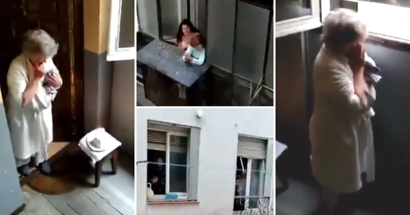 Соседи ѝ приредија емотивно изненадување на бабичка во Мадрид за нејзиниот 80. роденден. Бидејќи мора да бидат изолирани поради коронавирусот, тие ѝ поставија торта со свеќа пред вратата, а потоа ја повикаа да излезе.