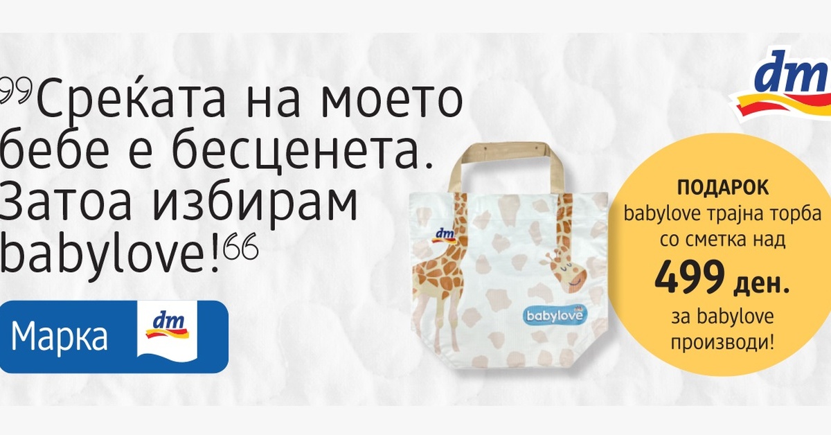 Од 1 до 31 август, односно до истек на залихите, со сметка над 499 денари за купени babylove производи во секоја dm дрогерија ќе добиете ПОДАРОК преслатка babylove ТРАЈНА ТОРБА.
