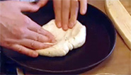 Премачкајте го дното и страните на плехот за печење со малку масло. Земете дел од тестото во форма на топка, и не се обидувајте да го сукате, туку ставете го директно во центарот на плехот. Со прстите нежно притискајте го тестото, полека растегнувајќи го од центарот кон страните на плехот.