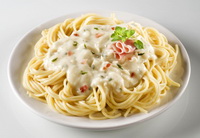 - Врз шпагетите ставете пармезан. Украсете со гранче магдонос.