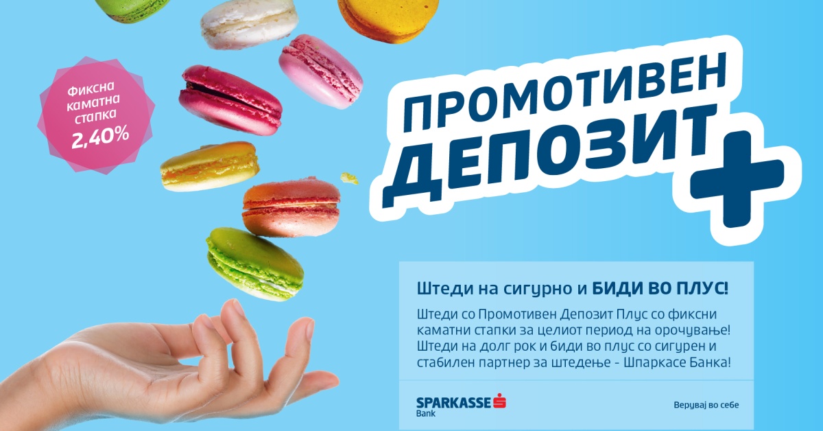 Шпаркасе Банка АД Скопје ја збогатува својата депозитна понуда со воведување нов производ – Промотивен депозит плус, со атрактивни фиксни каматни стапки, кои достигнуваат и 2,4% годишно за депозити на 36 месеци. Депозит плус е погоден за клиентите што се заинтересирани да штедат во денари на подолг период.