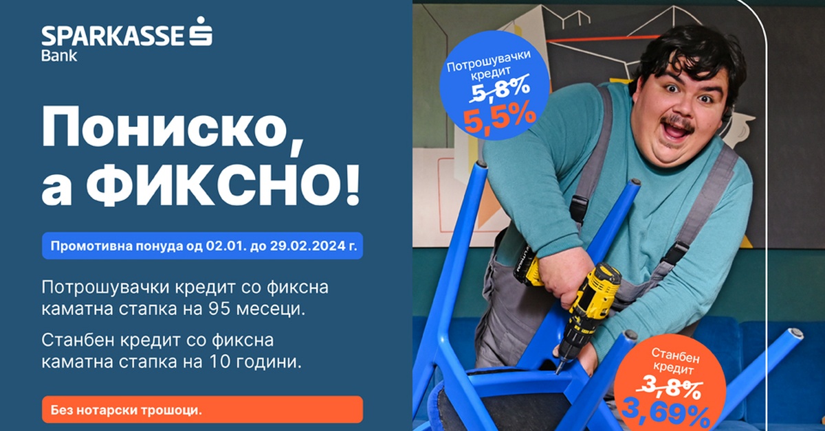 Шпаркасе Банка ја стартува годината со нова промотивна понуда, „Пониско, а фиксно“: Станбен и потрошувачки кредит со пониска фиксна каматна стапка
