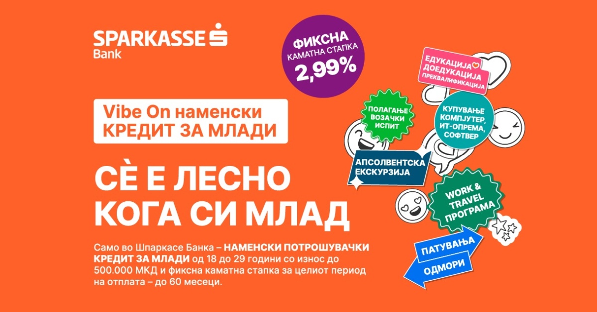 Шпаркасе Банка со задоволство го објавува лансирањето на својот нов потрошувачки кредит дизајниран специјално за млади луѓе на возраст од 18 до 29 години. Овој иновативен кредитен производ ја нагласува посветеноста на Банката да инвестира во иднината на следната генерација, обезбедувајќи неспоредлива финансиска поддршка за да им помогне на младите да ги постигнат своите аспирации и да изградат посветла иднина.