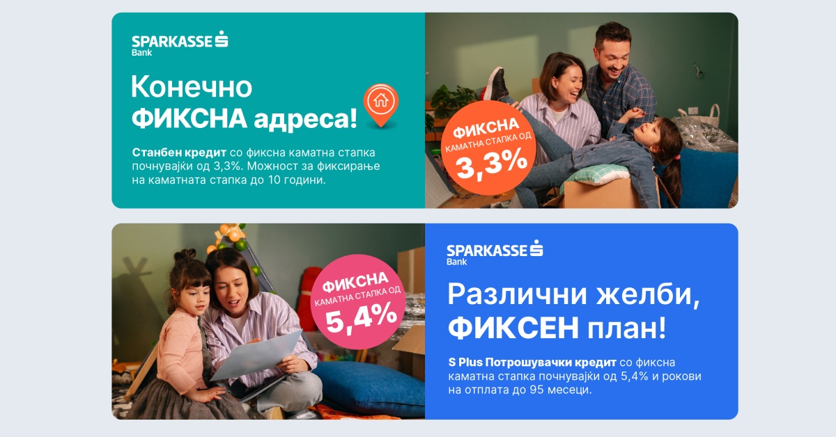 Една од најголемите поволности што Шпаркасе Банка им ја нуди на клиентите е фиксната каматна стапка, токму во време на зголемена несигурност и растечки тренд на каматите. Затоа, Шпаркасе Банка ги започнува кампањите Конечно ФИКСНА адреса! за станбен кредит, со фиксна каматна стапка почнувајќи од 3,3% за првите десет години, на максимален износ до 400.000 ЕУР со рок на отплата од 30 години, како и Различни желби, ФИКСЕН план! за S Plus потрошувачки кредит со фиксна каматна стапка почнувајќи од 5,4% и рокови на отплата до 95 месеци, на максимален износ до 1.500.000 денари. Понудата ќе трае сè до 31.5.2024 година.