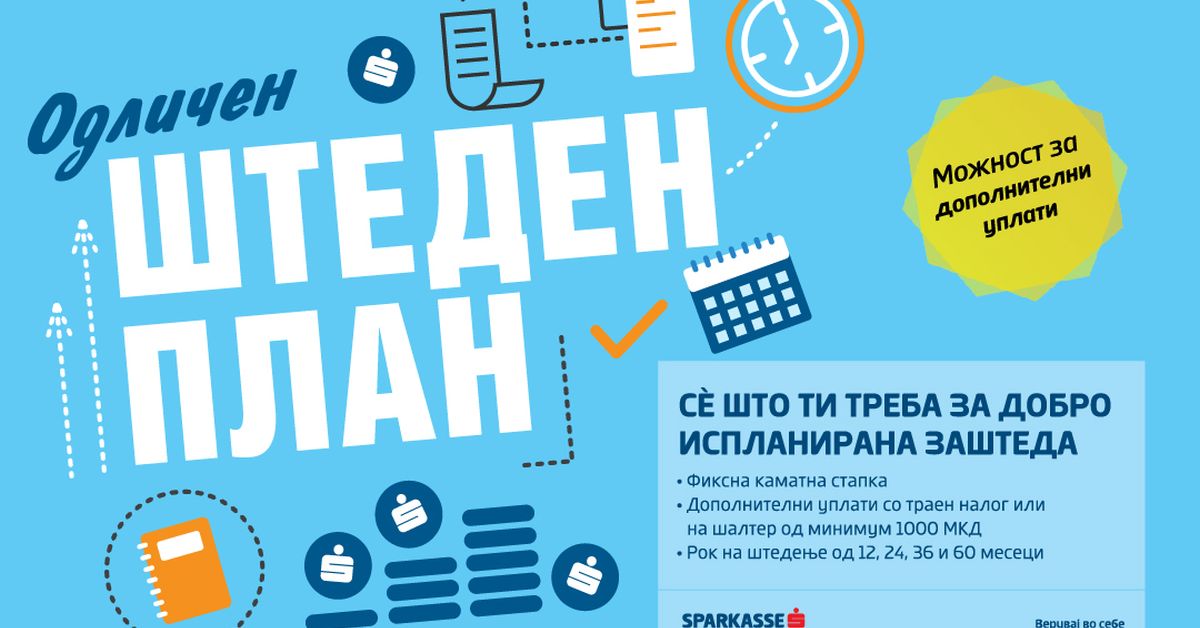 Од 1 јули 2022 година, Шпаркасе Банка АД Скопје ја збогатува својата депозитна понуда со нов депозит за физички лица – Штеден план, погоден за клиентите кои се заинтересирани да штедат во денари и кои сакаат да направат добар план за заштеда на подолг период.
