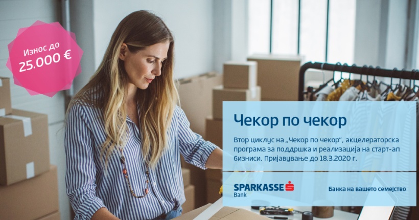 Шпаркасе Банка Македонија втора година по ред ќе го поддржи развојот на младите амбициозни претприемачи со идеја за создавање сопствен бизнис, кои имаат потреба од финансиска помош за понатамошен развој. „Чекор по чекор“ е првата акцелераторска програма од овој вид, која има за цел да обезбеди парична и општествена поддршка на компаниите што се во почетната фаза на отпочнување сопствен бизнис, со можност за кредитирање во износ до 25.000 евра и понуда на пакети за образовна, финансиска и менторска поддршка.