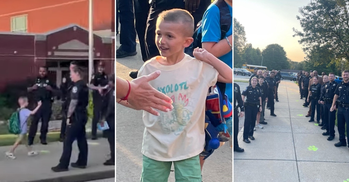 Група полицајци се собраа пред основно училиште за да го поздрават и испратат синот на нивен покоен колега на првиот училиштен ден.