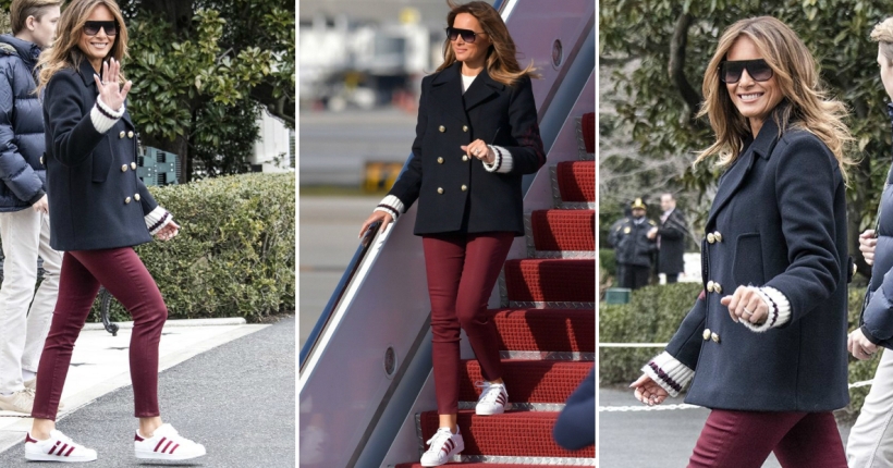 48-годишната г-ѓа Трамп носеше палто од Томи Хилфигер, бордо фармерки од Џеј бренд и патики од Адидас.