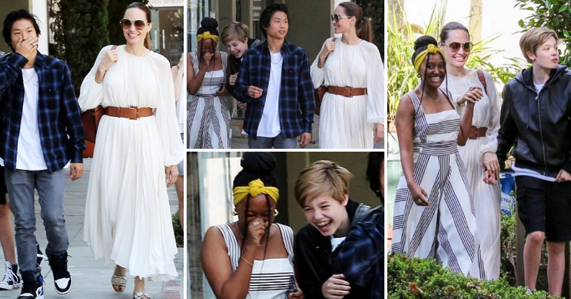 44-годишната актерка беше фотографирана додека се упатуваше на ручек со трите деца Пакс, Шајло и Захара во Вест Холивуд. Ѕвездата од „Maleficent“ носеше бел фустан со кафеав колан на половината.