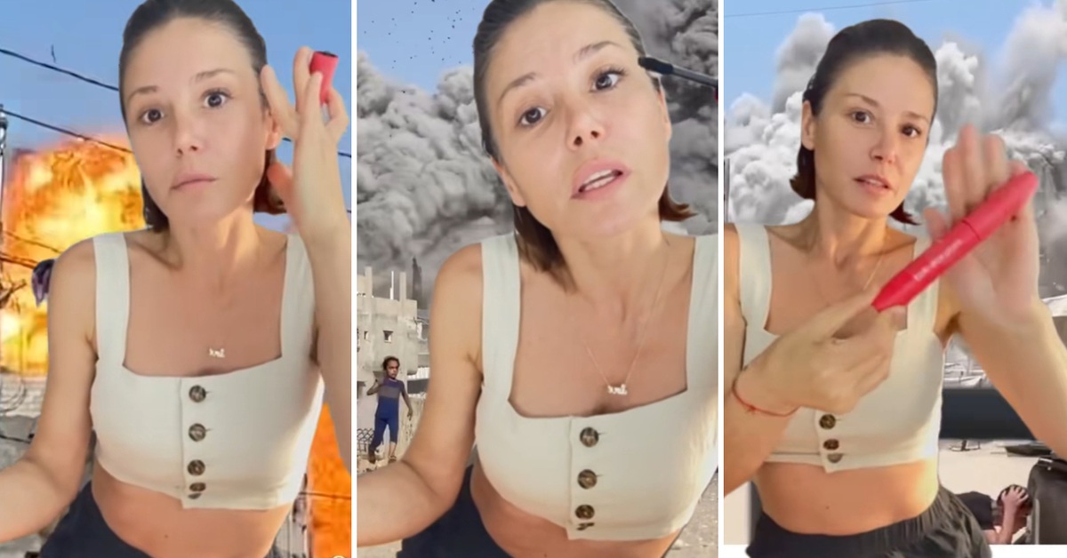 Српската водителка зборува за нова маскара која штотуку ѝ пристигнала. Со интонација типична за инфлуенсерски туторијал, таа ентузијастички раскажува за нејзините ефекти: „Трепките изгледаат здраво, го отвора окото, ефектот е неверојатен“. А во позадина, се прикажуваат реални снимки од експлозии од воени конфликти како во појасот Газа.
