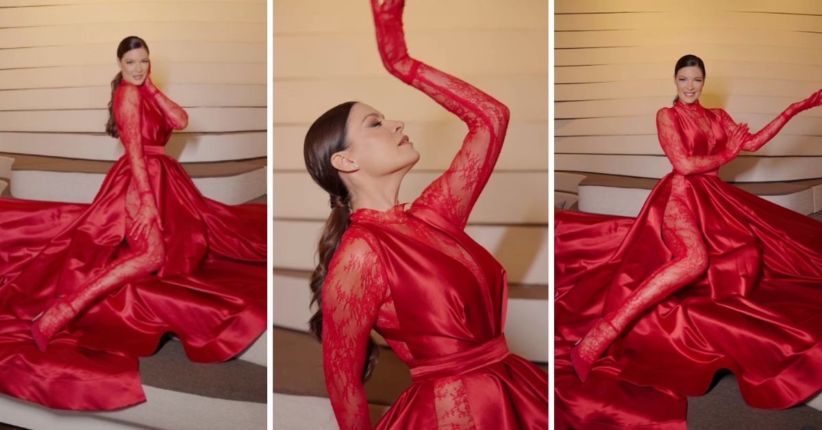 Атрактивната водителка на „Ѕвездите на Гранд“ блесна во црвена креација од дизајнерот Хусо Чобиќ, со кого негува одлична соработка.