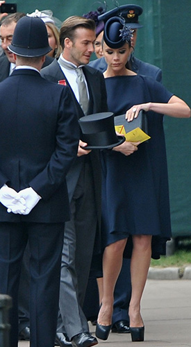 Популарната г-ѓа Бекам се вклопи во кралскиот стил на облекување со помош на шапка во форма на бонбона од познатиот дизајнер Филип Трејси. Гламурозната шапка Викторија ја искомбинира со едноставна фризура коњско опавче.