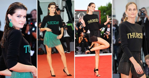 Славните модели се појавија во ист стајлинг, но со мала разлика во бојата и испишаниот ден на плетената блуза.