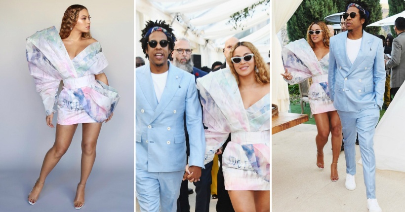 Фустанот на 37-годишната пејачка доаѓа од модната куќа Balmain, додека Џеј Зи е облечен во костум од Frère.