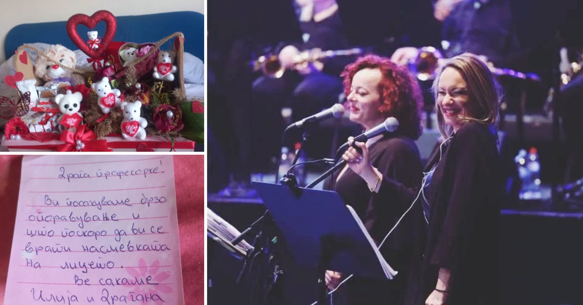 „Драга професорке, ви посакуваме брзо опоравување и што поскоро да ви се врати насмевката на лицето. Ве сакаме, Илија и Драгана“ – стои во нивната порака, испратена со прекрасен подарок.