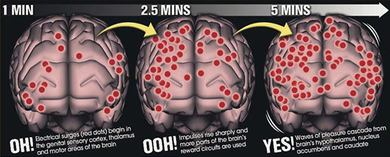 Во текот на тој период, скенерите правеле слика од мозокот на жените на секои 2 секунди за да се види кои делови се активираат за време на оргазам. Снимките покажале дека кај жените се активираат многу различни области од мозокот како центрите за допир, емоции, задоволство и памтење.