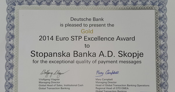 И оваа година Стопанска банка АД - Скопје ја потврди својата професионалност и ефикасност во сферата на меѓународните плаќања, за што доби признание од Дојче Банка преку Златната награда Straight-Through Processing (STP) Excellence Award за 2014 година.