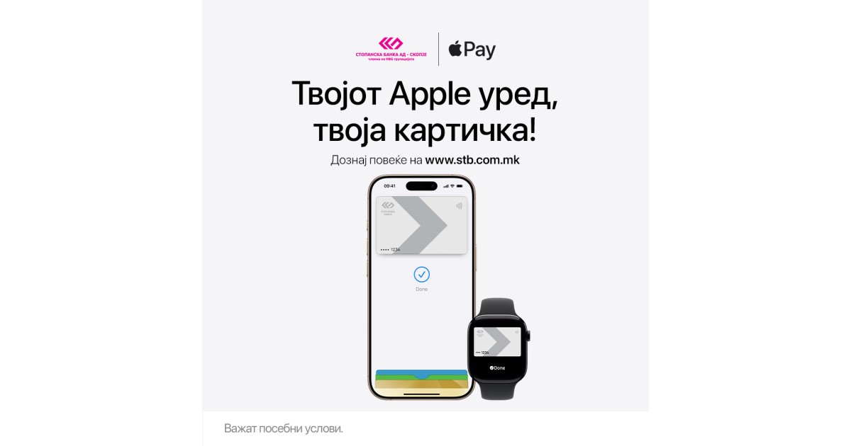 Стопанска банка од денеска на своите клиенти им го овозможува Apple Pay за брз, едноставен и безбеден начин на плаќање со своите Visa и MasterCard платежни картички користејќи Apple уред.