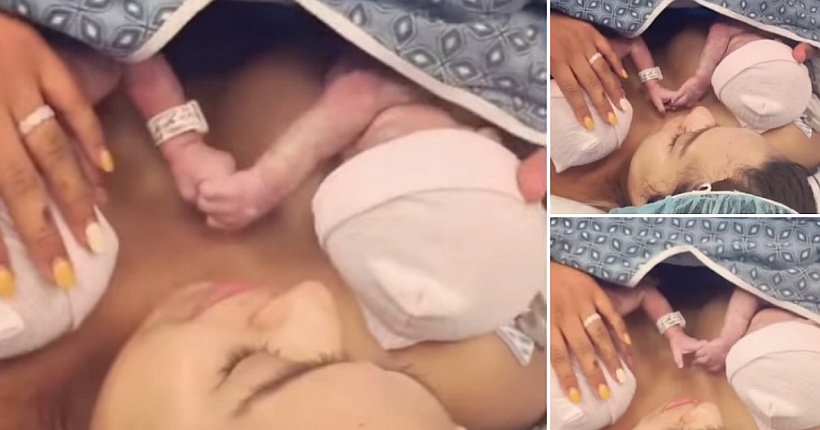 Откако докторот ќе ги постави малите бебенца на градите на мајката, едното посегнува за да ја фати раката на другото.