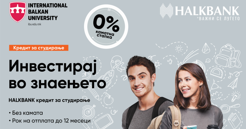 Меѓународен Балкански универзитет и Халкбанк АД Скопје со цел да помогнат во едуцирање на младите создадоа заеднички производ – Студентски кредит со 0% камата и со промотивна школарина од 1000 евра. Целта на оваа кампања насловена „Инвестирај во знаењето“ е на студентите и нивните семејства да им се понуди уникатна можност да можат да одберат квалитетно и меѓународно образование, а со домашни услови на финансирање. Во оваа кампања, Меѓународен Балкански универзитет ќе ја покрие каматата за студентскиот кредит, а студентот, односно родителите ќе ја плаќаат школарината кон универзитетот на 12 еднакви месечни рати без камата.