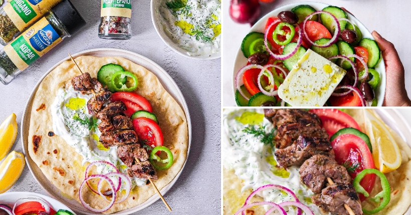 Овој пат не одиме многу далеку, само неколку стотици километри на југ и се инспирираме од грчката кујна која е дел од медитеранското семејство. Рецептот опфаќа подготовка на суфлаки (парчиња месо нанижани на стапчиња и испечени на скара, претходно отстоени во маринада со многу зачини), домашни пита лепчиња, ѕаѕики сос и свежа грчка салата.