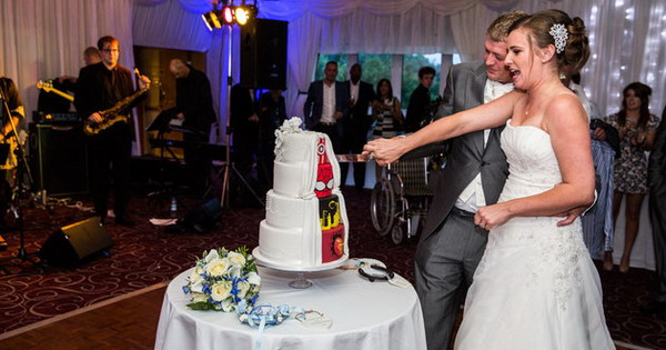 На фотографиите се гледа дека свадбената торта на англискиот пар однапред е онаква каква што посакувала невестата – со бисери, свила и бели ружи. Но, на задната страна зад завестите се ѕирка „суперхеројски колаж“ инспириран од Капетан Америка, Спајдермен, Бетмен и Железниот човек. Разумен свадбен компромис.