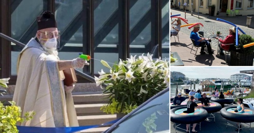 Свештеник ги прска верниците со детско пиштолче, бизарни капи... Смешни начини за социјално дистанцирање