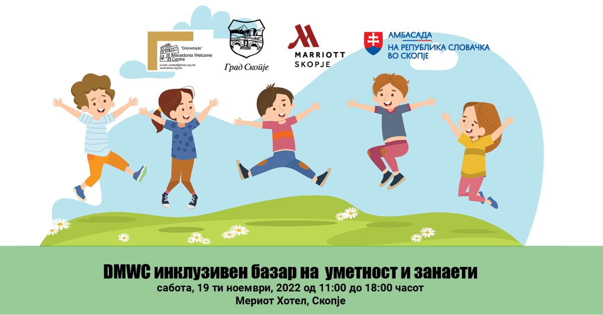 По повод Светскиот ден на детето – еднаквост и вклученост за секое дете, здружението „Добредојде“ Macedonia Welcome Centre има чест да ве покани на „DMWC Инклузивен базар за уметност и занаети“ кој ќе се одржи во сабота, 19 ноември 2022 година, од 11:00 до 18:00 часот во Скопје Мериот Хотел, 2 кат.
