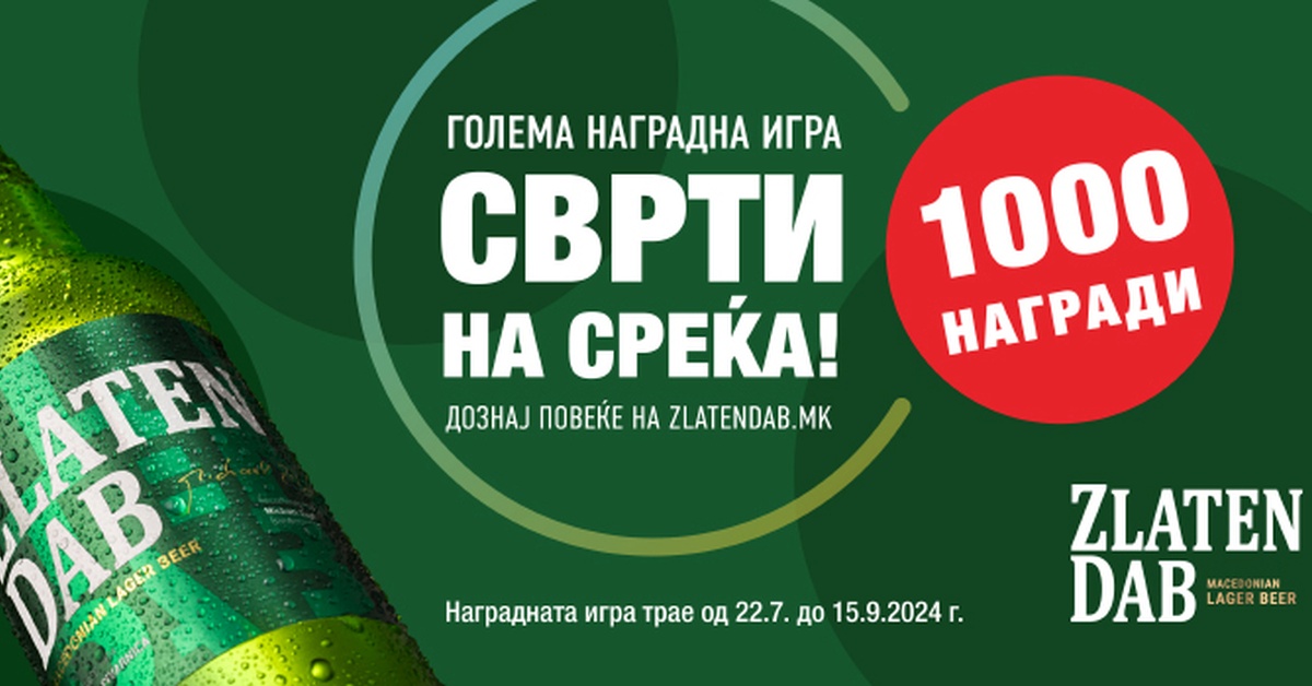 Од денес, 22 јули 2024 година, започнува големата наградна игра „Сврти на среќа“ со Златен Даб. Во наградната игра учествуваат пакувањата со специјално дизајнирана етикета за наградната игра, односно шишињата во стаклена амбалажа од 0,33 л и 0,5 л, како и шишињата во пластична амбалажа од 1,5 л.