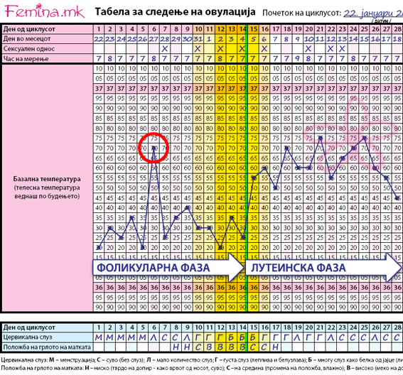 Откако ќе ја пополните табелата, ќе забележите дека вредностите на левата страна се пониски од оние на десната. Причината за тоа е што во првиот дел од менструалниот циклус базалната температура е ниска, а во вториот, поради присуството на прогестерон – повисока.