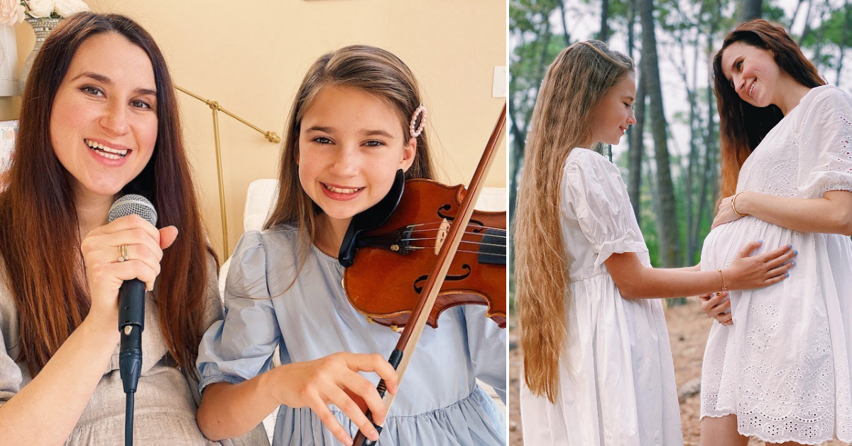 Во видеото, младата виолинистка и пејачка ја исполнува познатата песна заедно со својата мајка, која го очекува третото дете.
