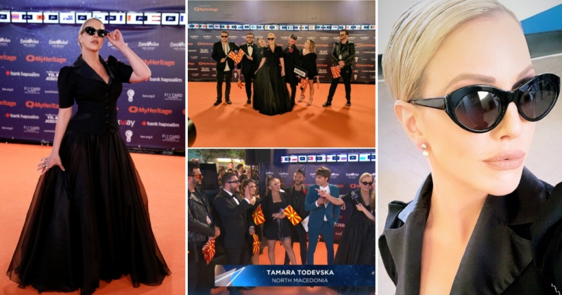 Тамара Тодевска елегантна во црн аутфит и накит Rebecca со тимот на портокаловиот тепих на Евровизија