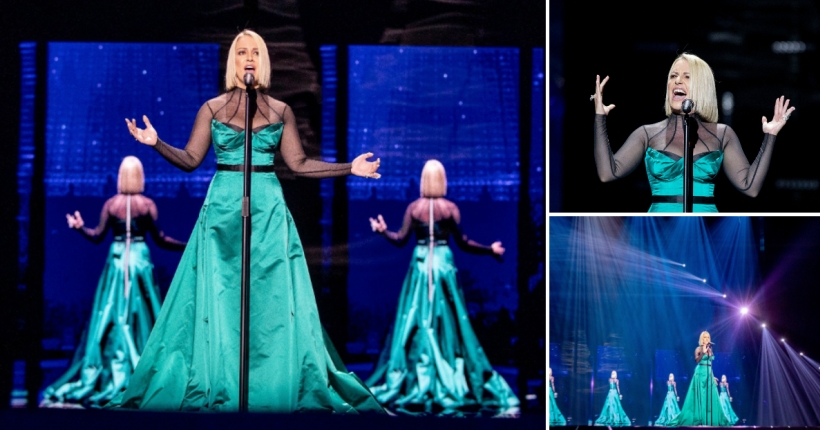 33-годишната македонска пејачка се појавува на сцената сама додека зад неа има шест нејзини рефлексии.
