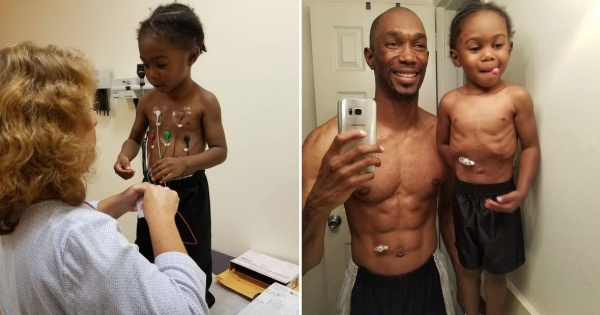 Татко си лепи туба за хранење на стомакот за да му покаже на болното синче дека не е само