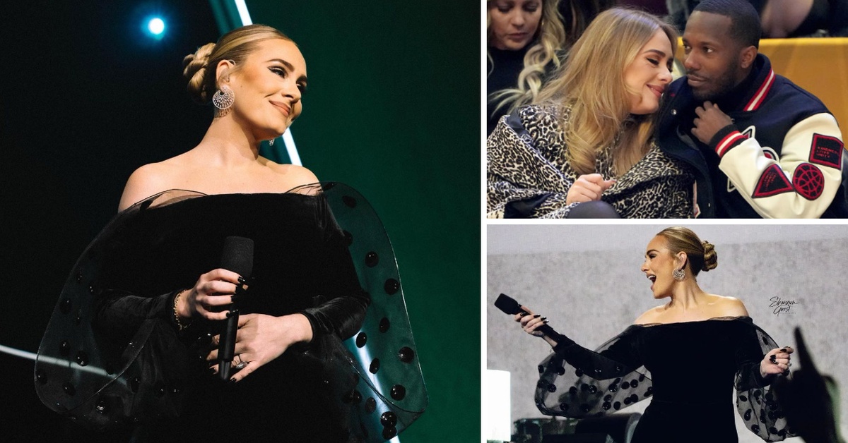 На сцената, Адел блескаше во црна креација со разголени рамена и волуменозни ракави.